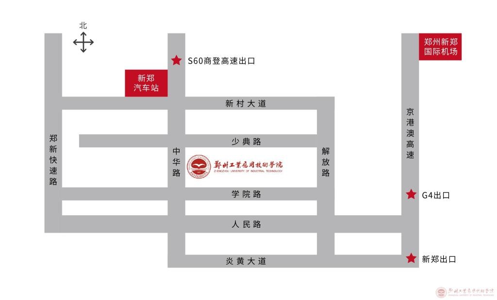 4、郑州火车站:乘地铁1号线——紫荆山站转2号线——华南城地铁站乘202路公交车——到达学院;